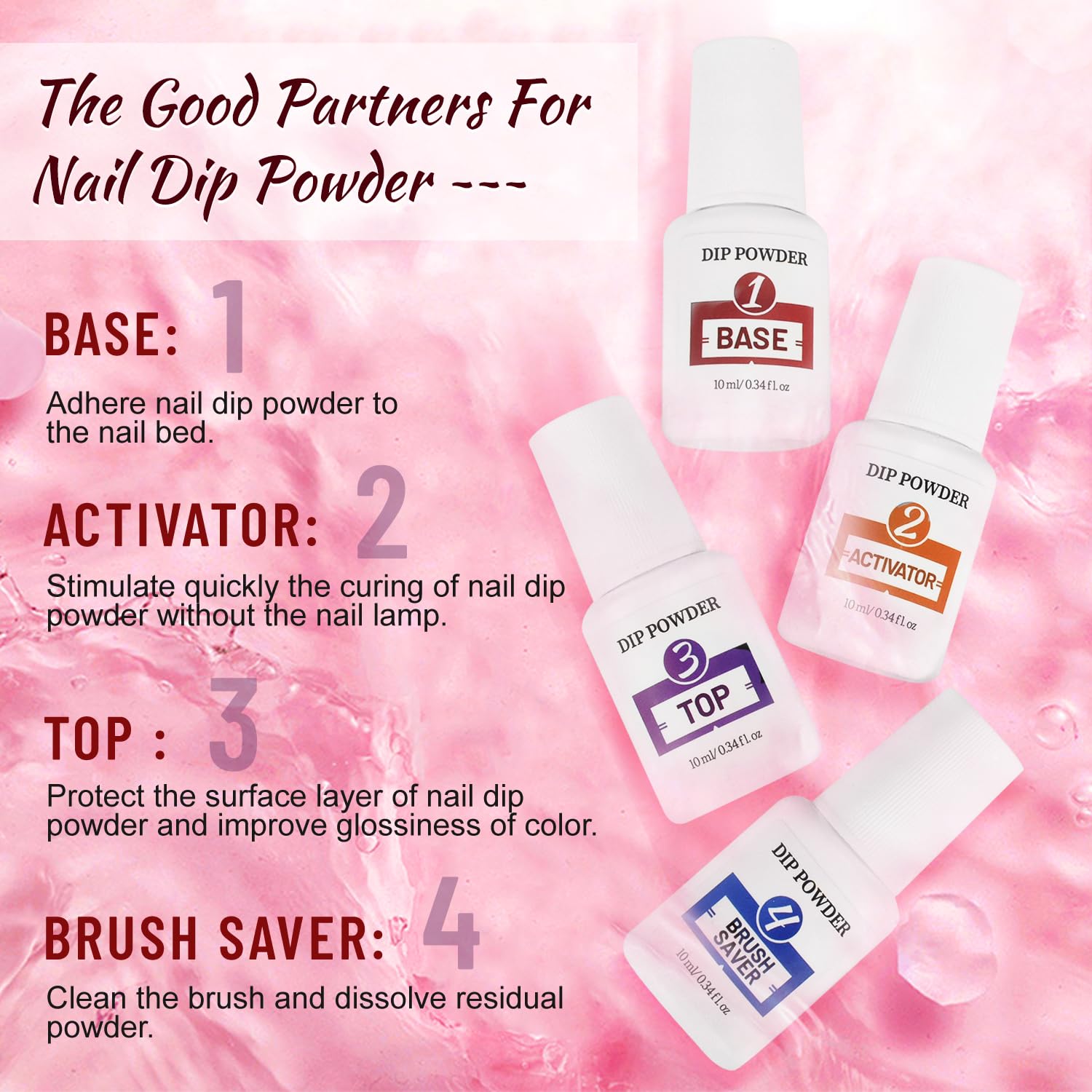 What You Receive: 32 bottles of colored nail dip powder with a capacity of 10 grams.4 pcs dip powder set.(one bottle of base coat and top coat,one bottle of activator and brush saver) And some manicure tools.